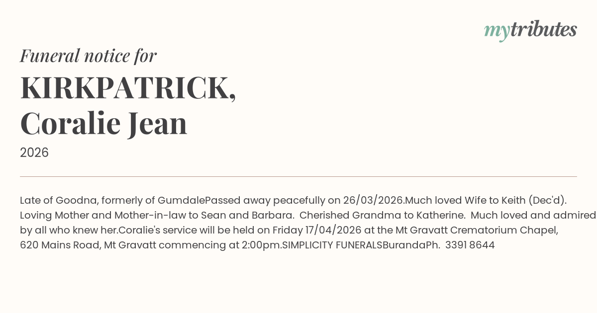 Coralie's service will be held on Friday 17/04/2026 at the Mt Gravatt Crematorium Chapel, 620 Mains Road, Mt Gravatt commencing at 2:00pm.