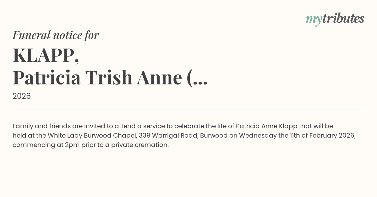 15°CFamily and friends are invited to attend a service to celebrate the life of Patricia Anne Klapp that will be held at the White Lady Burwood Chapel, 339 Warrigal Road, Burwood on Wednesday the 11th of February 2026, commencing at 2pm prior to a private cremation.