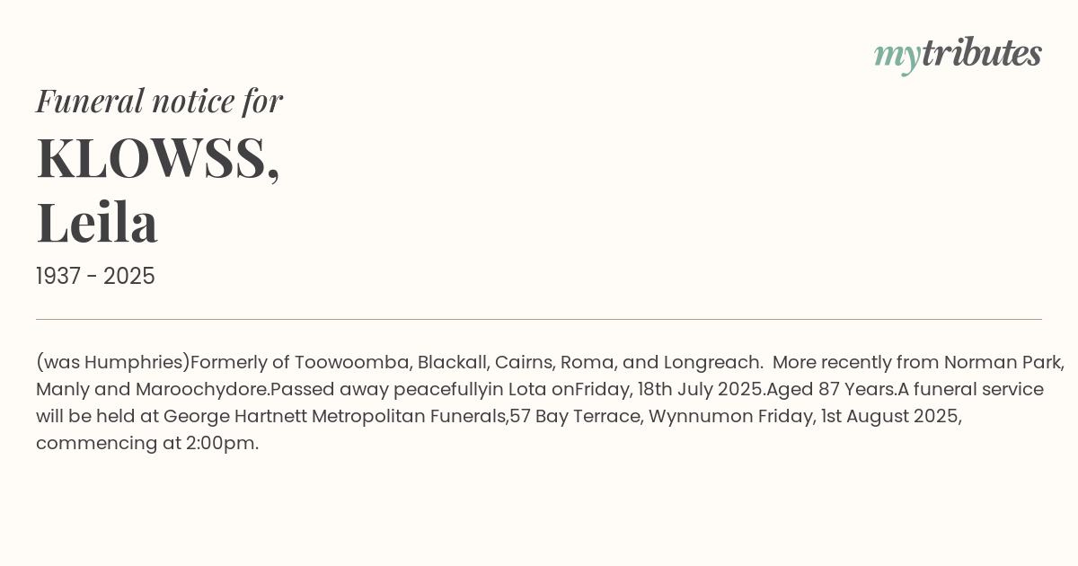 Funeral by : George Hartnett Metropolitan Funerals Wynnum