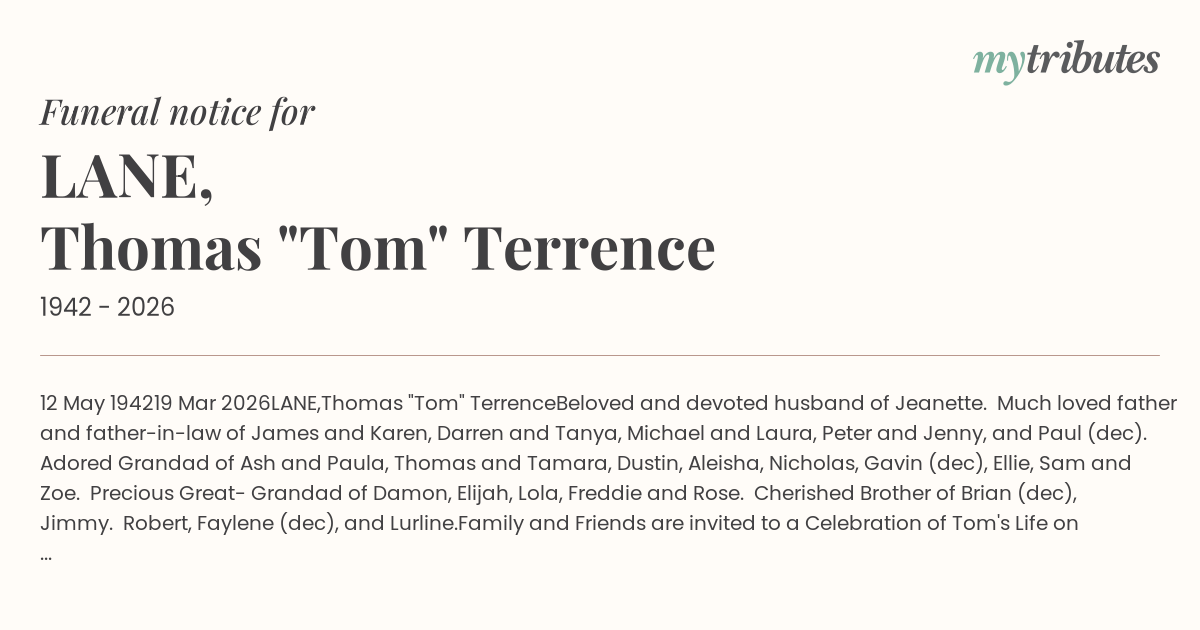 Family and Friends are invited to a Celebration of Tom's Life on Tuesday 31st March 2026 commencing at 11:00am to be held at St Mary's Catholic Church, 1B Elizabeth Street, Woodend, followed by Burial at Warrill Park Lawn Cemetery, 12 Anderson Day Drive, Willowbank.