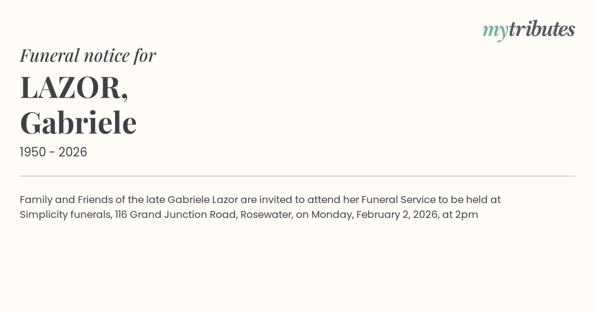 15°CFamily and Friends of the late Gabriele Lazor are invited to attend her Funeral Service to be held at Simplicity funerals, 116 Grand Junction Road, Rosewater, on Monday, February 2, 2026, at 2pm