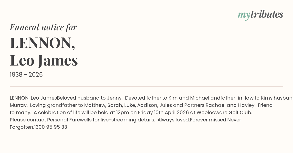 Loving grandfather to Matthew, Sarah, Luke, Addison, Jules and Partners Rachael and Hayley. Friend to many.