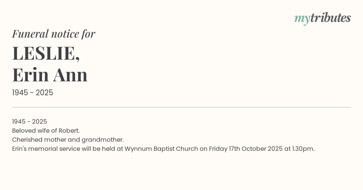 Erin's memorial service will be held at Wynnum Baptist Church on Friday 17th October 2025 at 1.30pm.
