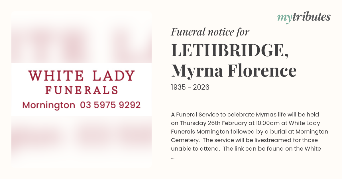 15°CA Funeral Service to celebrate Myrna’s life will be held on Thursday 26th February at 10:00am at White Lady Funerals Mornington followed by a burial at Mornington Cemetery. The service will be livestreamed for those unable to attend. The link can be found on the White Lady Funerals website under 'Upcoming Funerals'