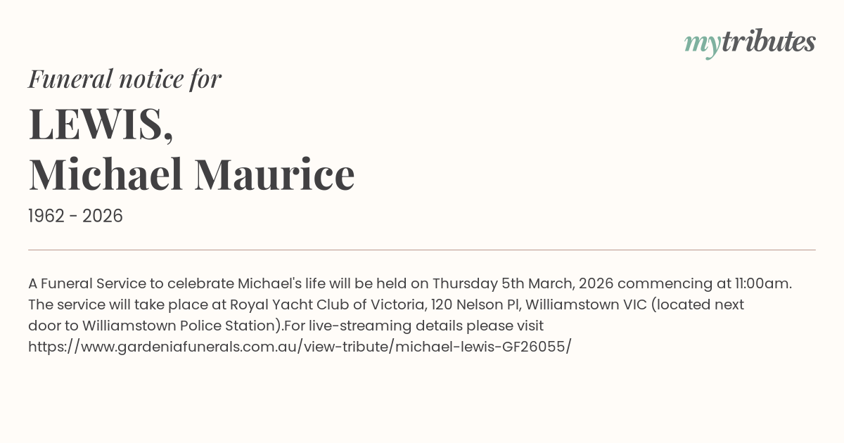 15°CA Funeral Service to celebrate Michael's life will be held on Thursday 5th March, 2026 commencing at 11:00am. The service will take place at Royal Yacht Club of Victoria, 120 Nelson Pl, Williamstown VIC (located next door to Williamstown Police Station).