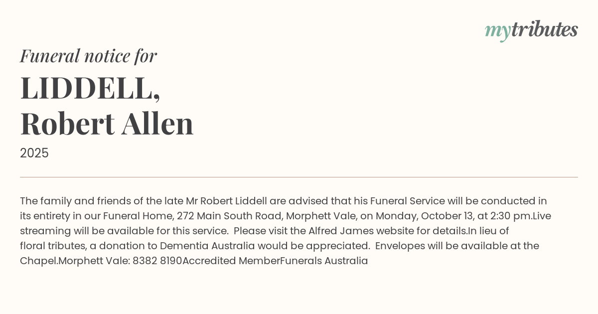 15°CThe family and friends of the late Mr Robert Liddell are advised that his Funeral Service will be conducted in its entirety in our Funeral Home, 272 Main South Road, Morphett Vale, on Monday, October 13, at 2:30 pm.