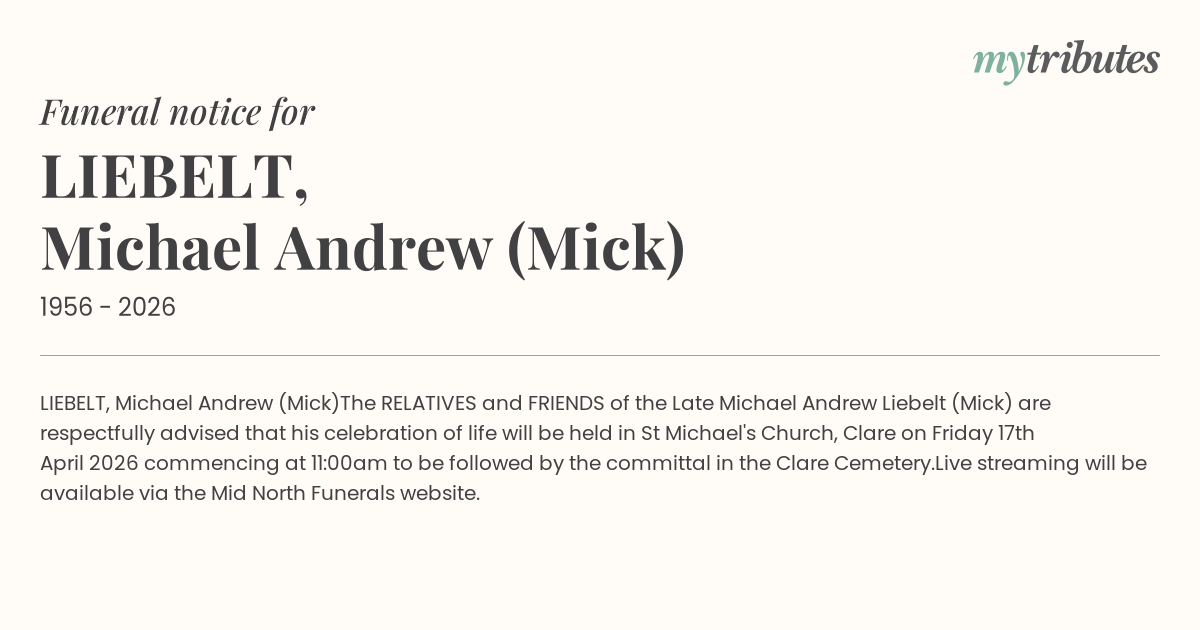 The RELATIVES and FRIENDS of the Late Michael Andrew Liebelt (Mick) are respectfully advised that his celebration of life will be held in St Michael's Church, Clare on Friday 17th April 2026 commencing at 11:00am to be followed by the committal in the Clare Cemetery.