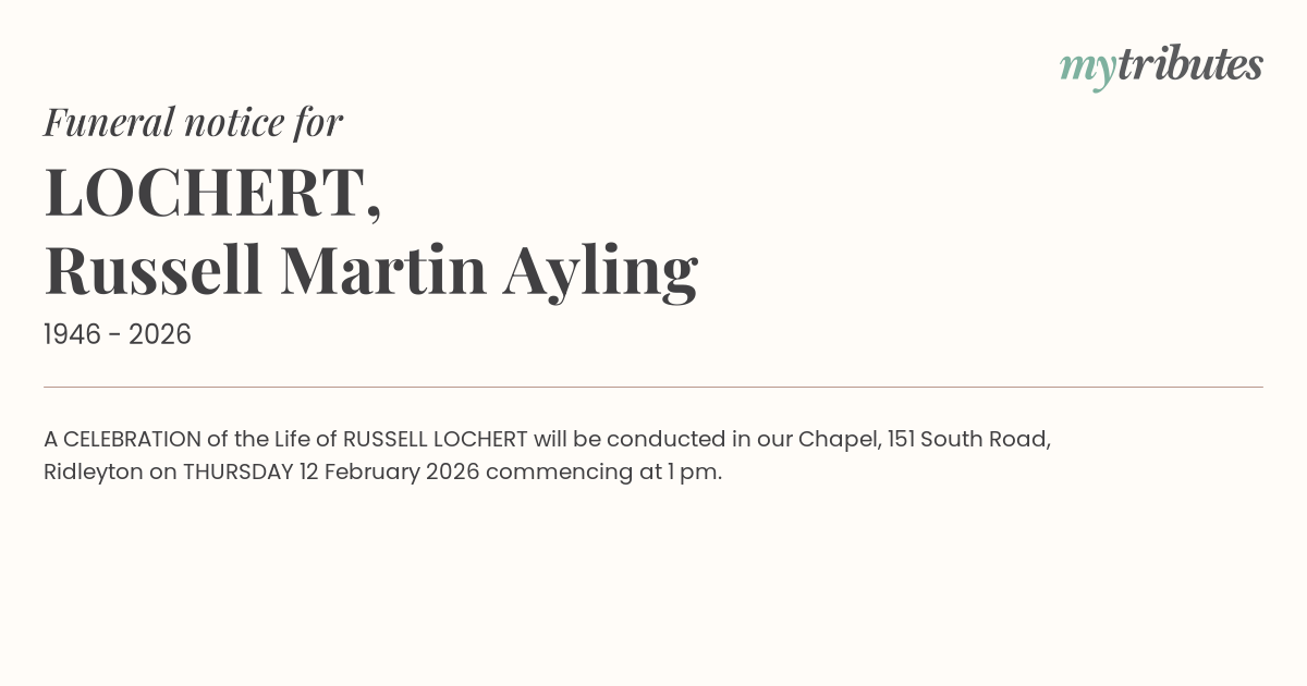 15°CA CELEBRATION of the Life of RUSSELL LOCHERT will be conducted in our Chapel, 151 South Road,