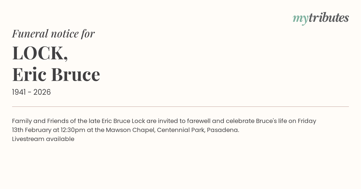 15°CFamily and Friends of the late Eric Bruce Lock are invited to farewell and celebrate Bruce's life on Friday 13th February at 12:30pm at the Mawson Chapel, Centennial Park, Pasadena.