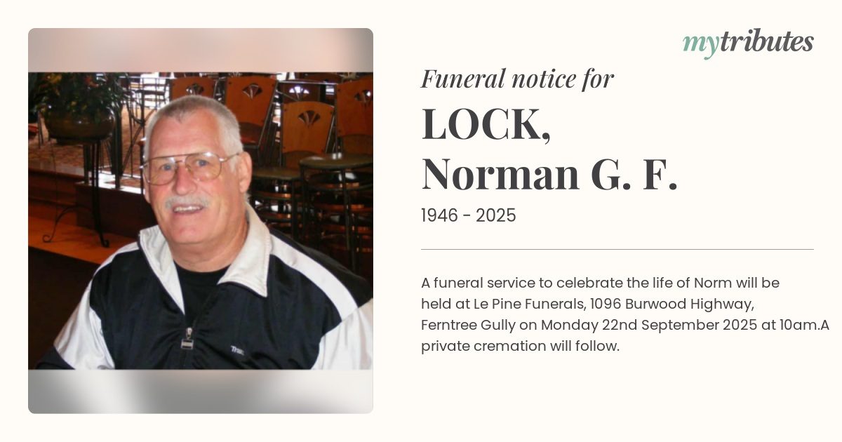 15°CA funeral service to celebrate the life of Norm will be held at Le Pine Funerals, 1096 Burwood Highway, Ferntree Gully on Monday 22nd September 2025 at 10am.