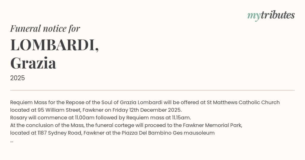 15°CRequiem Mass for the Repose of the Soul of Grazia Lombardi will be offered at St Matthew’s Catholic Church located at 95 William Street, Fawkner on Friday 12th December 2025.