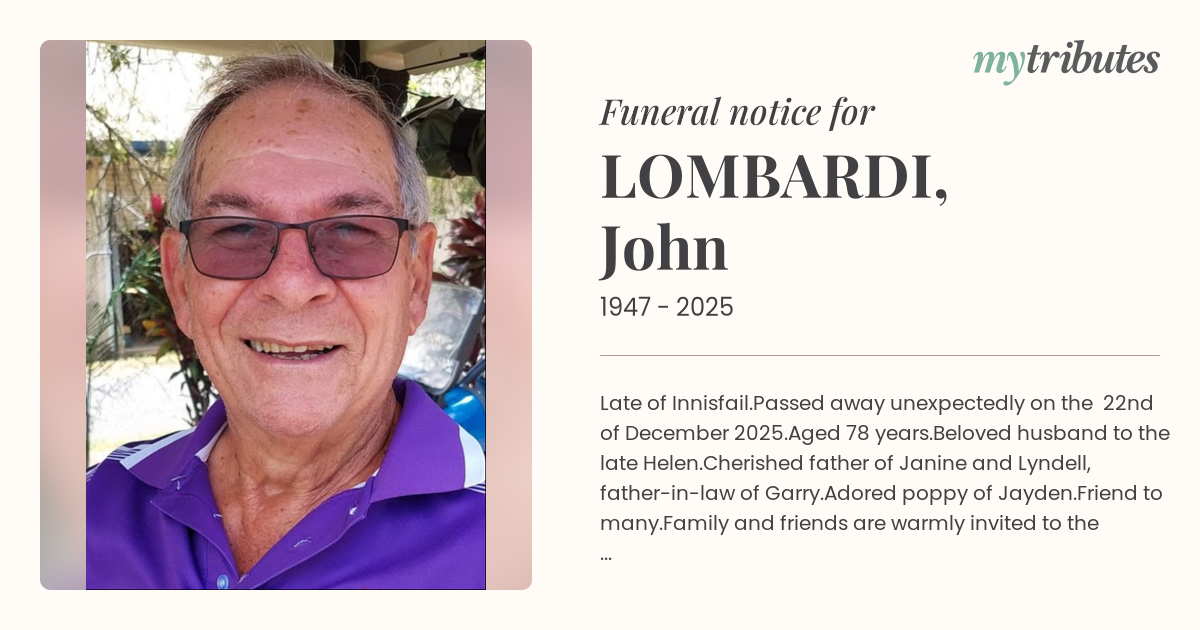 Family and friends are warmly invited to the celebration of John’s life which will be held at Black's Funerals Chapel, 18 Scullen Avenue, Innisfail on Friday,