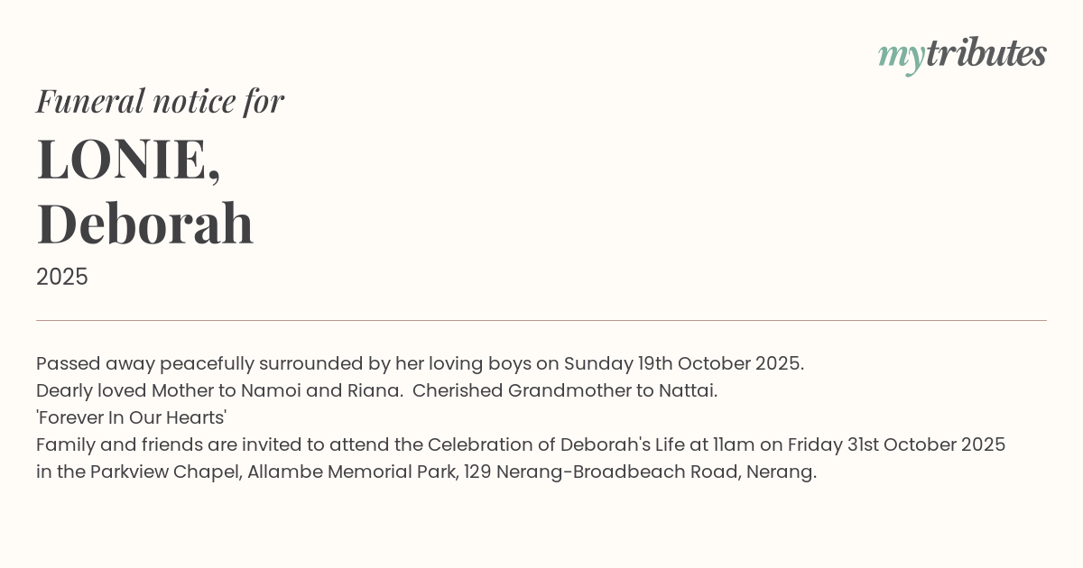 Family and friends are invited to attend the Celebration of Deborah's Life at 11am on Friday 31st October 2025 in the Parkview Chapel, Allambe Memorial Park, 129 Nerang-Broadbeach Road, Nerang.