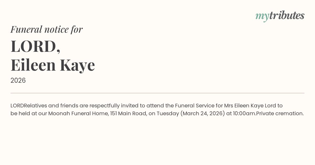 Relatives and friends are respectfully invited to attend the Funeral Service for Mrs Eileen Kaye Lord to be held at our Moonah Funeral Home, 151 Main Road, on Tuesday (March 24, 2026) at 10:00am.