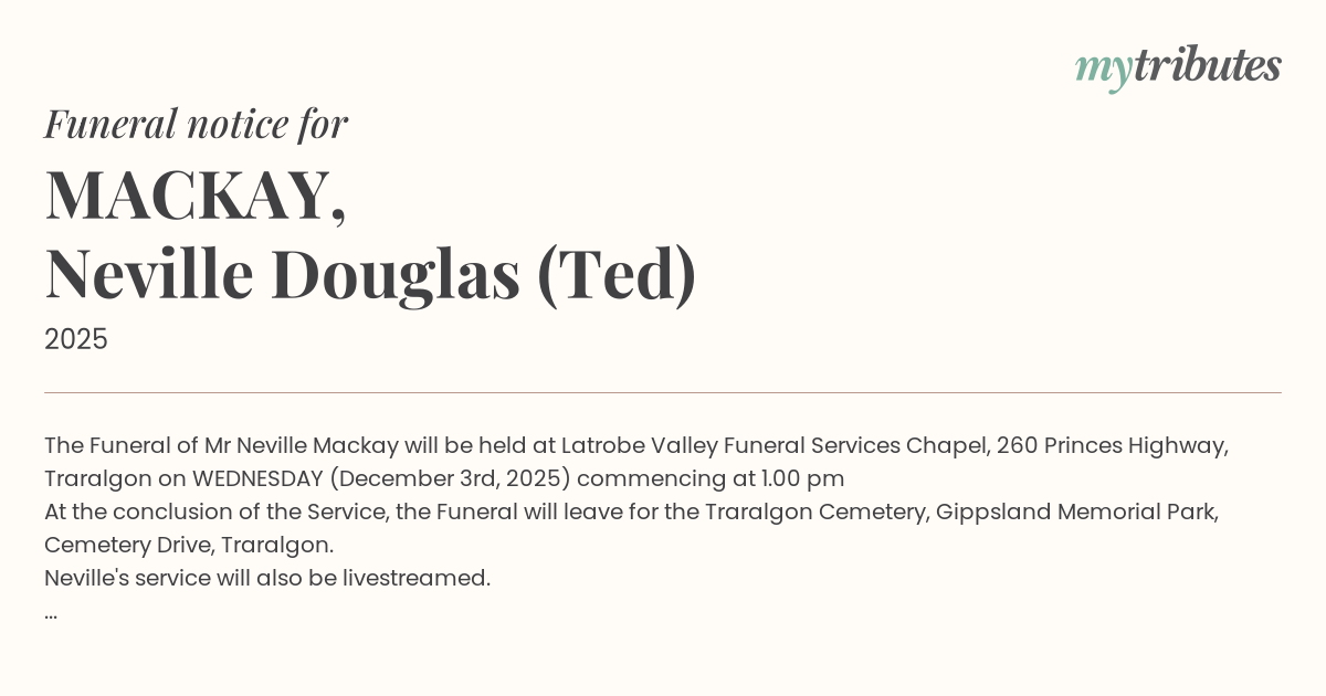 15°CThe Funeral of Mr Neville Mackay will be held at Latrobe Valley Funeral Services Chapel, 260 Princes Highway, Traralgon on WEDNESDAY (December 3rd, 2025) commencing at 1.00 pm