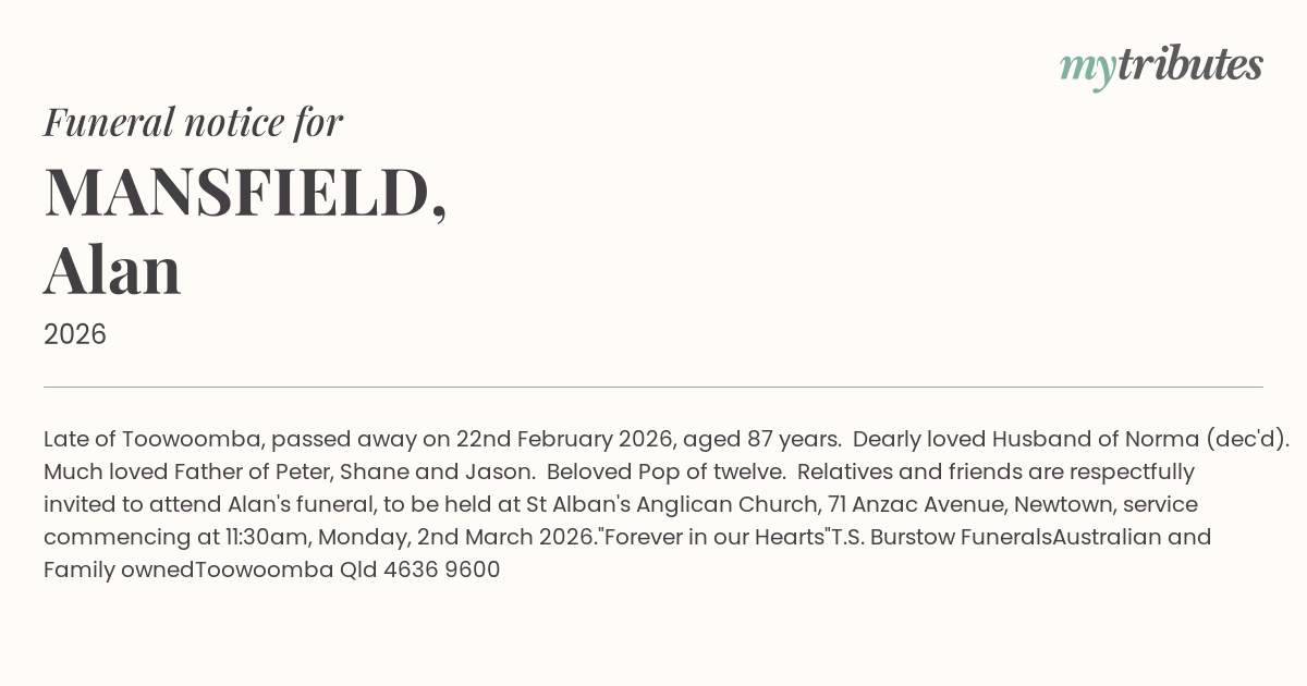 Relatives and friends are respectfully invited to attend Alan's funeral, to be held at St Alban's Anglican Church, 71 Anzac Avenue, Newtown, service commencing at 11:30am, Monday, 2nd March 2026.