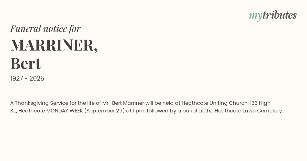 15°CA Thanksgiving Service for the life of Mr. Bert Marriner will be held at Heathcote Uniting Church, 133 High St., Heathcote MONDAY WEEK (September 29) at 1 pm, followed by a burial at the Heathcote Lawn Cemetery.