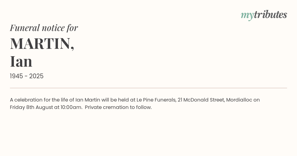 15°CA celebration for the life of Ian Martin will be held at Le Pine Funerals, 21 McDonald Street, Mordialloc on Friday 8th August at 10:00am. Private cremation to follow.