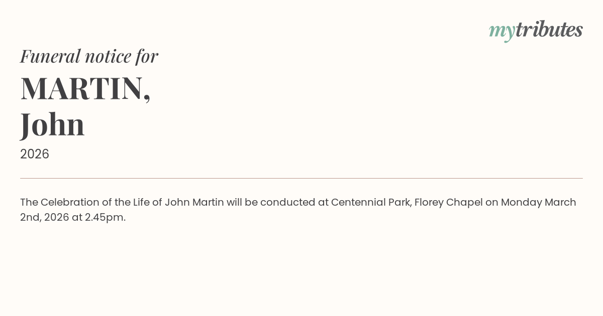 15°CThe Celebration of the Life of John Martin will be conducted at