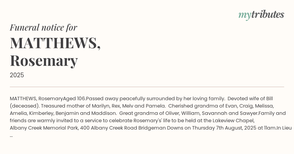 Family and friends are warmly invited to a service to celebrate Rosemary's' life to be held at the Lakeview Chapel, Albany Creek Memorial Park, 400 Albany Creek Road Bridgeman Downs on Thursday 7th August, 2025 at 11am.