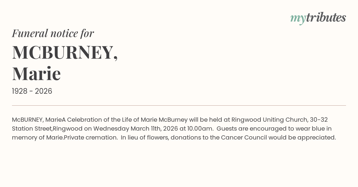 Ringwood on Wednesday March 11th, 2026 at 10.00am. Guests are encouraged to wear blue in memory of Marie.