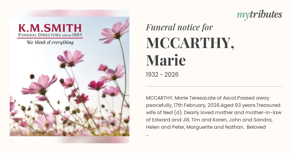 A Funeral Mass to celebrate Marie's life, will be held at St Cecilia's Catholic Church, 30 College Street, Hamilton, Thursday, 26th February 2026, at 12 p.m., followed by burial at Pinnaroo Lawn Cemetery.
