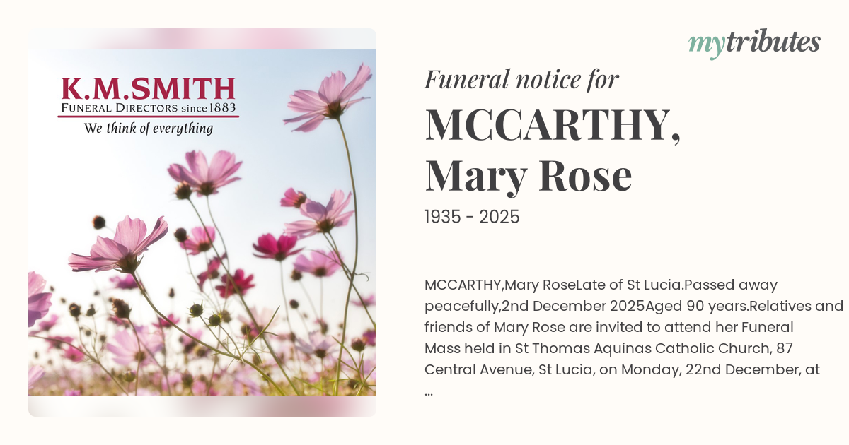 Relatives and friends of Mary Rose are invited to attend her Funeral Mass held in St Thomas Aquinas Catholic Church, 87 Central Avenue, St Lucia, on Monday, 22nd December, at 10:00 a.m., followed by burial at Nudgee Cemetery.