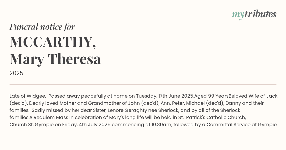 A Requiem Mass in celebration of Mary's long life will be held in St. Patrick's Catholic Church, Church St, Gympie on Friday, 4th July 2025 commencing at 10.30am, followed by a Committal Service at Gympie Cemetery.