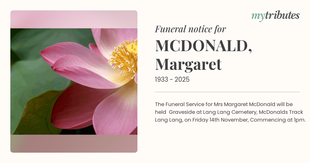 15°CThe Funeral Service for Mrs Margaret McDonald will be held Graveside at Lang Lang Cemetery, McDonalds Track Lang Lang, on Friday 14th November, Commencing at 1pm.