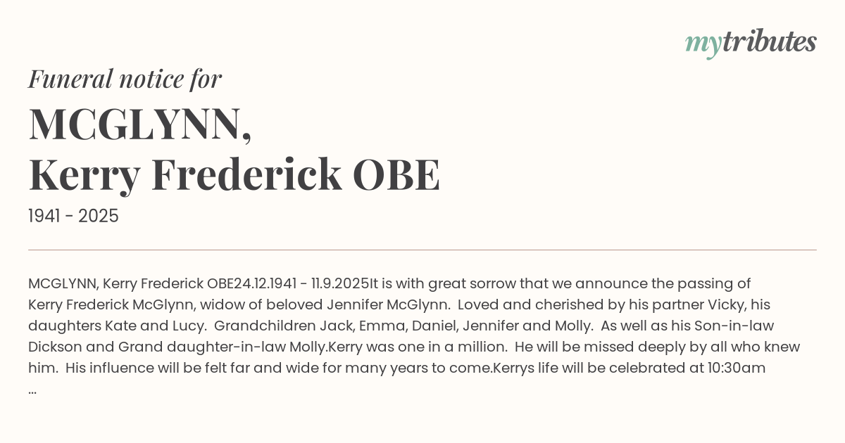 McGlynn. Loved and cherished by his partner Vicky, his daughters Kate and Lucy. Grandchildren Jack, Emma, Daniel, Jennifer and Molly.