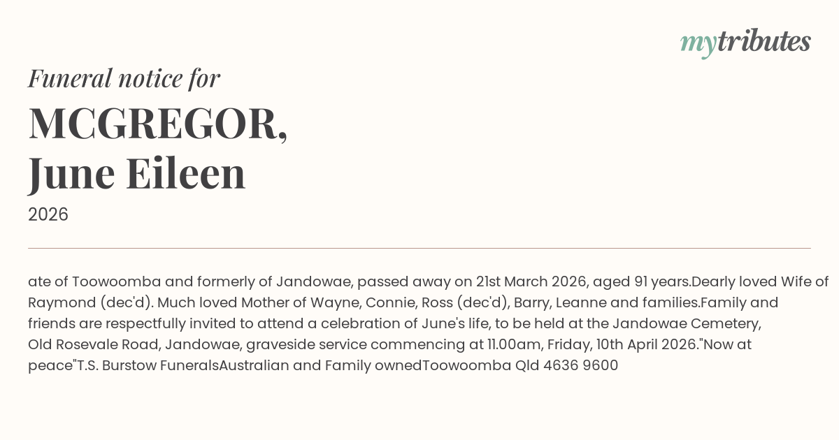Family and friends are respectfully invited to attend a celebration of June's life, to be held at the Jandowae Cemetery, Old Rosevale Road, Jandowae, graveside service commencing at 11.00am, Friday, 10th April 2026.