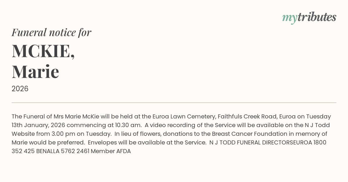 15°CThe Funeral of Mrs Marie McKie will be held at the Euroa Lawn Cemetery, Faithfuls Creek Road, Euroa on Tuesday 13th January, 2026 commencing at 10.30 am. A video recording of the Service will be available on the N J Todd Website from 3.00 pm on Tuesday. In lieu of flowers, donations to the Breast Cancer Foundation in memory of Marie would be preferred. Envelopes will be available at the Service.
