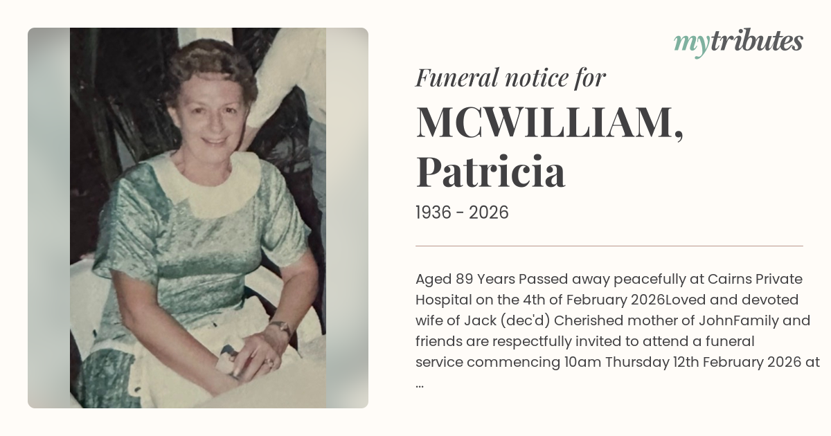 15°CAged 89 Years Passed away peacefully at Cairns Private Hospital on the 4th of February 2026