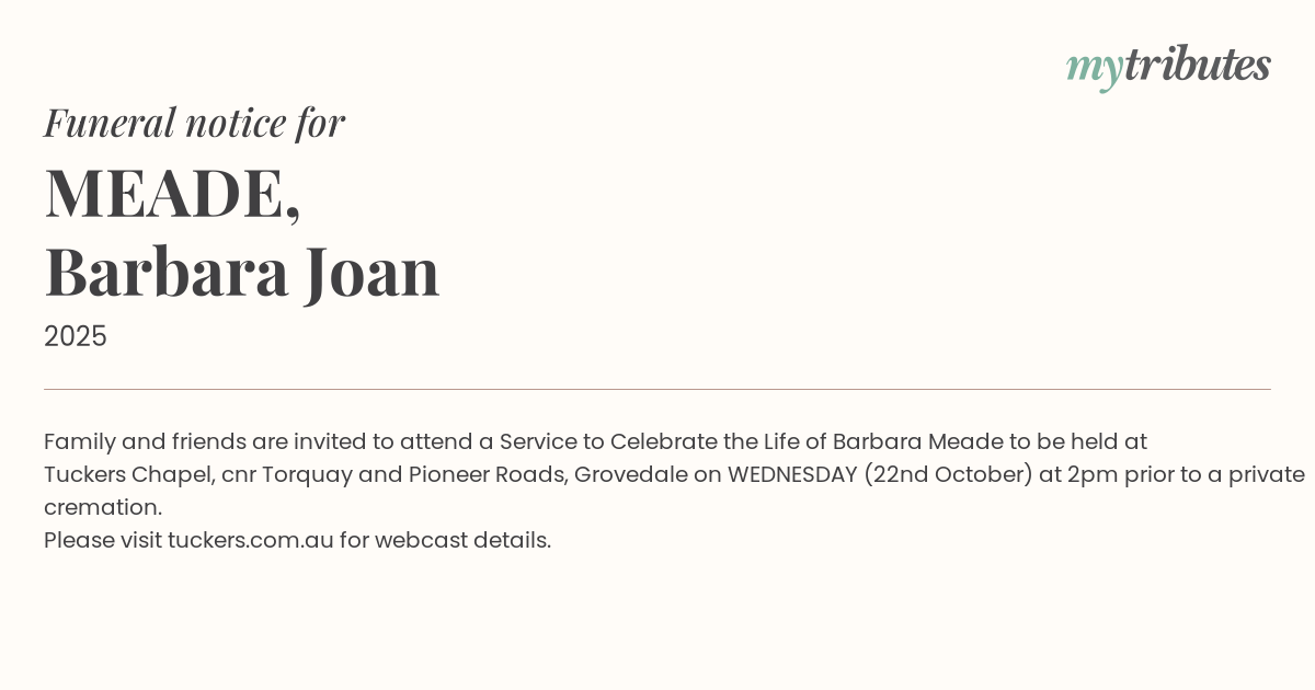15°CFamily and friends are invited to attend a Service to Celebrate the Life of Barbara Meade to be held at Tuckers Chapel, cnr Torquay and Pioneer Roads, Grovedale on WEDNESDAY (22nd October) at 2pm prior to a private cremation.