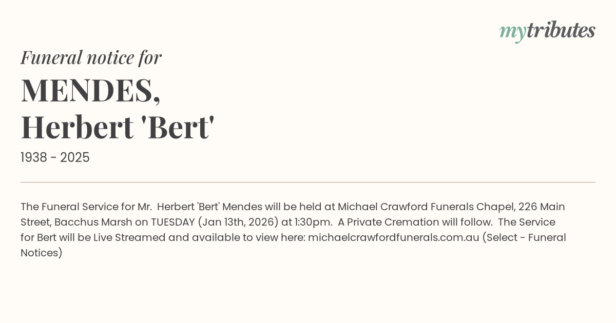 15°CThe Funeral Service for Mr. Herbert 'Bert' Mendes will be held at Michael Crawford Funerals Chapel, 226 Main Street, Bacchus Marsh on TUESDAY (Jan 13th, 2026) at 1:30pm. A Private Cremation will follow. The Service for Bert will be Live Streamed and available to view here: michaelcrawfordfunerals.com.au (Select - Funeral Notices)