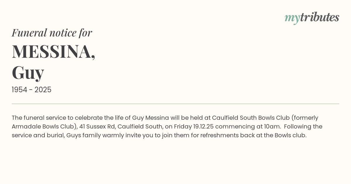 15°CThe funeral service to celebrate the life of Guy Messina will be held at Caulfield South Bowls Club (formerly Armadale Bowls Club), 41 Sussex Rd, Caulfield South, on Friday 19.12.25 commencing at 10am. Following the service and burial, Guy’s family warmly invite you to join them for refreshments back at the Bowls club.