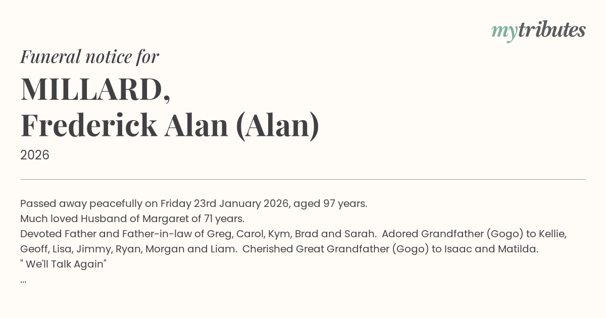 15°CPassed away peacefully on Friday 23rd January 2026, aged 97 years. Much loved Husband of Margaret of 71 years. Devoted Father and Father-in-law of Greg, Carol, Kym, Brad and Sarah. Adored Grandfather (Gogo) to Kellie, Geoff, Lisa, Jimmy, Ryan, Morgan and Liam. Cherished Great Grandfather (Gogo) to Isaac and Matilda. " We'll Talk Again" Family and Friends are warmly invited to attend the Celebration of Alan's Life at 11am on Monday 2nd February 2026 in the Parkview Chapel, Allambe Memorial Park, 129 Nerang-Broadbeach Road, Nerang.