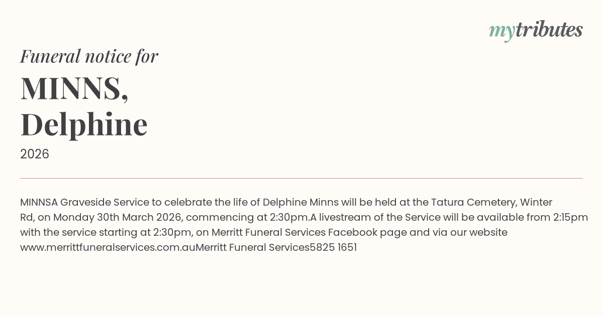 A Graveside Service to celebrate the life of Delphine Minns will be held at the Tatura Cemetery, Winter Rd,