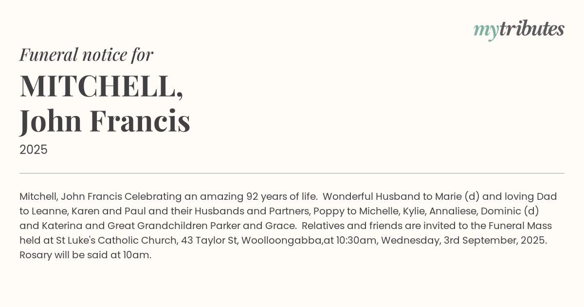 Relatives and friends are invited to the Funeral Mass held at St Luke's Catholic Church, 43 Taylor St, Woolloongabba,