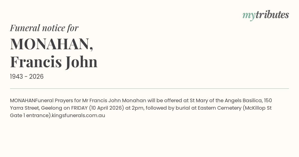 (10 April 2026) at 2pm, followed by burial at Eastern Cemetery (McKillop St Gate 1 entrance).