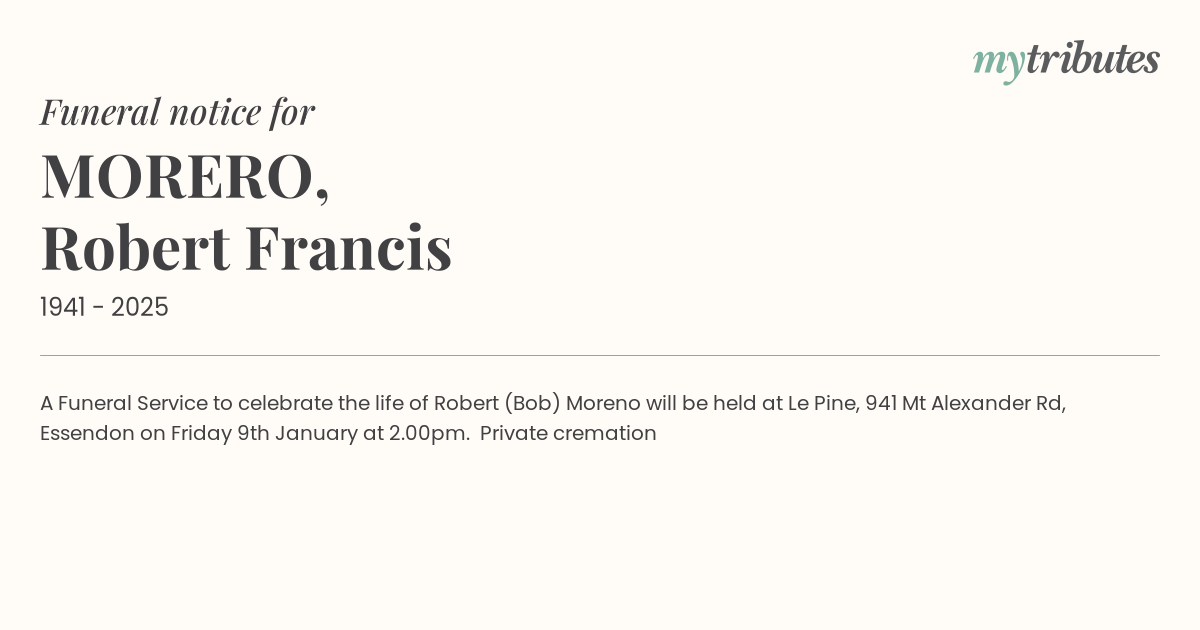15°CA Funeral Service to celebrate the life of Robert (Bob) Moreno will be held at Le Pine, 941 Mt Alexander Rd, Essendon on Friday 9th January at 2.00pm. Private cremation