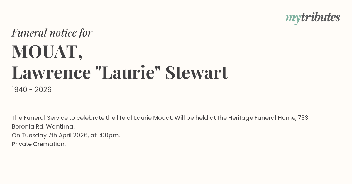 15°CThe Funeral Service to celebrate the life of Laurie Mouat, Will be held at the Heritage Funeral Home, 733 Boronia Rd, Wantirna.