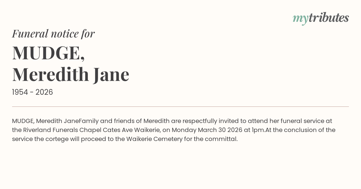 Family and friends of Meredith are respectfully invited to attend her funeral service at the Riverland Funerals Chapel Cates Ave Waikerie, on Monday March 30 2026 at 1pm.