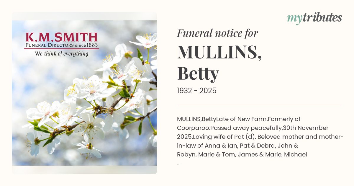 Relatives and friends are invited to attend Betty's funeral mass to be held in St James Catholic Church, 165 Old Cleveland Road, Coorparoo, on Tuesday, 9th December, at 1.00 p.m.