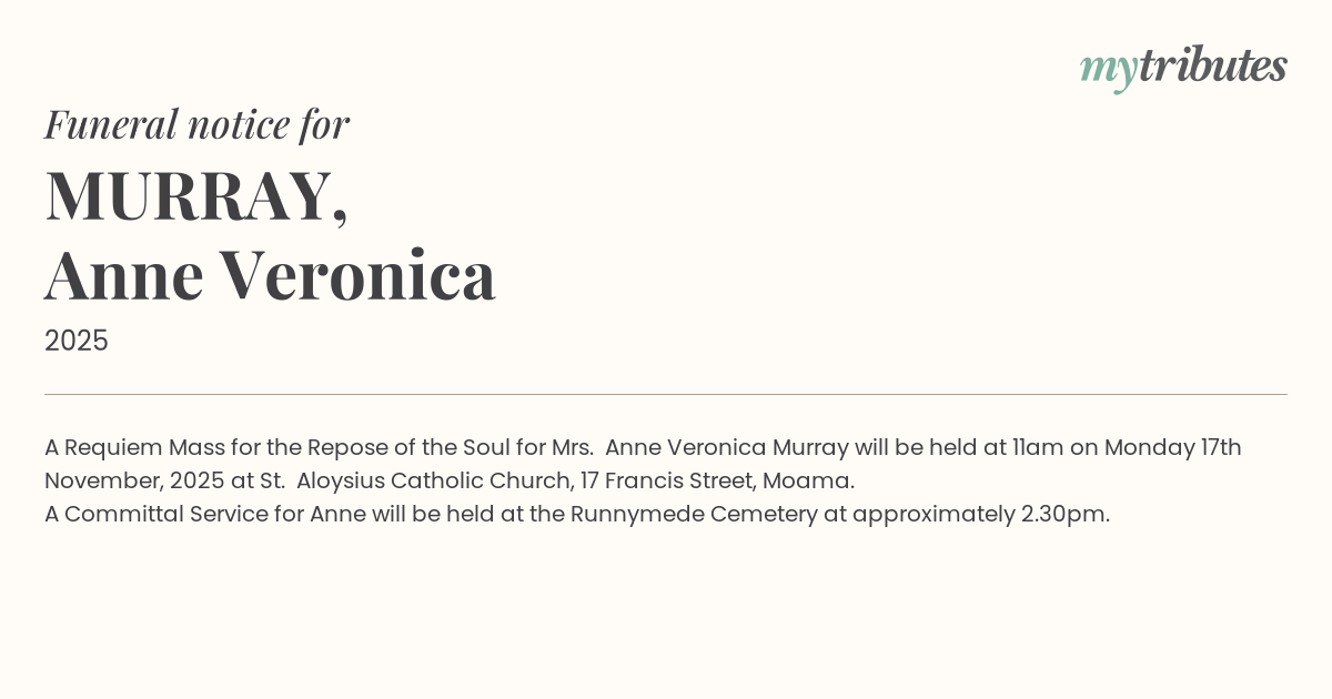 15°CA Requiem Mass for the Repose of the Soul for Mrs. Anne Veronica Murray will be held at 11am on Monday 17th November, 2025 at St. Aloysius Catholic Church, 17 Francis Street, Moama.