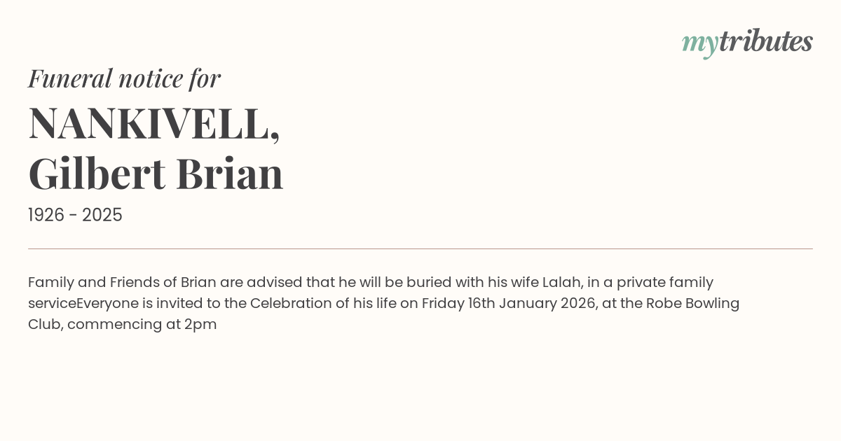 Everyone is invited to the Celebration of his life on Friday 16th January 2026, at the Robe Bowling Club, commencing at 2pm