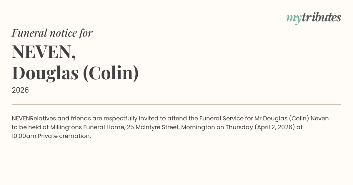 Relatives and friends are respectfully invited to attend the Funeral Service for Mr Douglas (Colin) Neven to be held at Millingtons Funeral Home, 25 McIntyre Street, Mornington on Thursday (April 2, 2026) at 10:00am.
