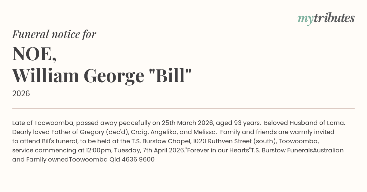 Family and friends are warmly invited to attend Bill's funeral, to be held at the T.S. Burstow Chapel, 1020 Ruthven Street (south), Toowoomba, service commencing at 12:00pm, Tuesday, 7th April 2026.