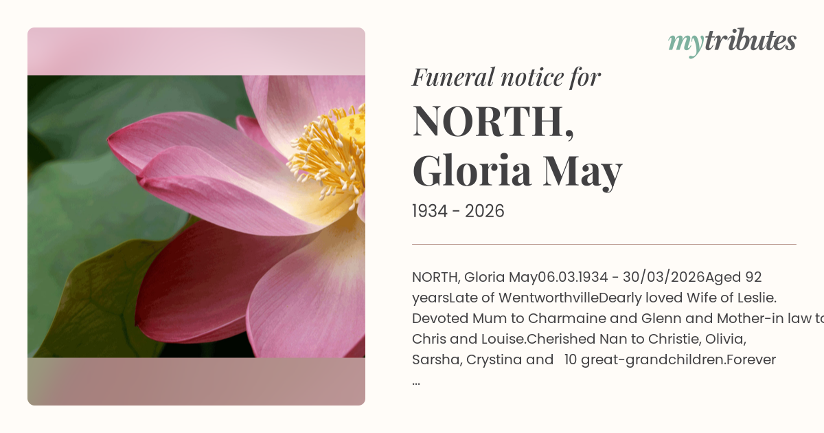 Gloria's family warmly invite you to attend a Celebration of her Life at White Lady Funerals, 402 Pennant Hills Road, Pennant Hills on Thursday 9th April, 2026 at 10am.
