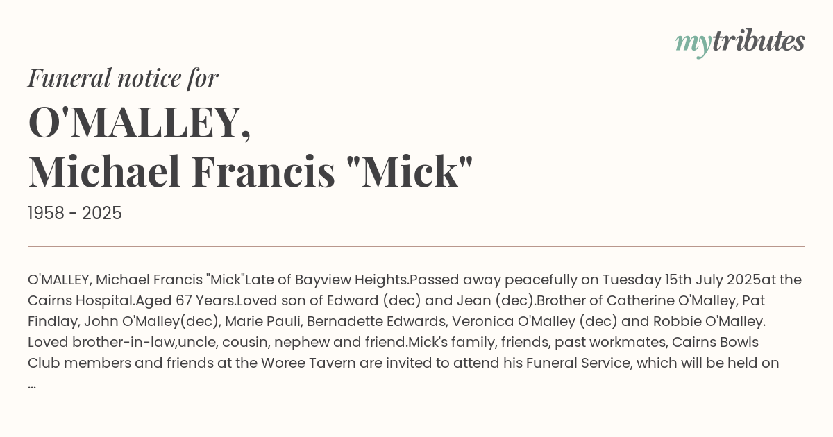 Mick's family, friends, past workmates, Cairns Bowls Club members and friends at the Woree Tavern are invited to attend his Funeral Service, which will be held on Friday 25th July 2025, commencing at 2.00pm in the Chapel of Cairns Funeral Directors,36 Pease Street, Manoora.